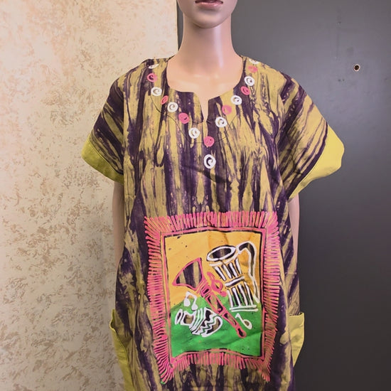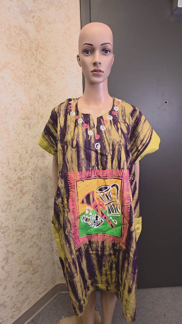 Celebrate artistry and culture with the Cultural Harmony Kampala Dress, a beautifully hand-dyed piece that captures the essence of African creativity. This dress features a vibrant hand-painted centerpiece of traditional African instruments in orange, green, and red, surrounded by soft mustard and dark brown tones.
