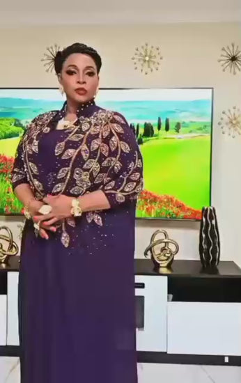 Step into elegance with this deep purple dress featuring a beautifully embellished cape overlay with gold-toned accents, creating a dramatic and refined silhouette. The streamlined gown underneath highlights your figure while the cape detail adds majestic flair—perfect for formal events, church gatherings or upscale celebrations. Finished with a stylish belt to define the waist and enhance the polished look.
