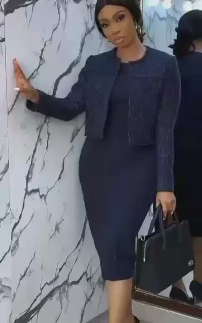 A polished and elegant Executive Navy Blue Corporate Dress Set designed for women who love a refined and professional look. This set features a fitted knee-length dress paired with a matching cropped blazer, giving you a clean and classy silhouette. Perfect for office wear, presentations, business meetings, Sunday service, or formal events. Simple, sophisticated, and confidence-boosting.
