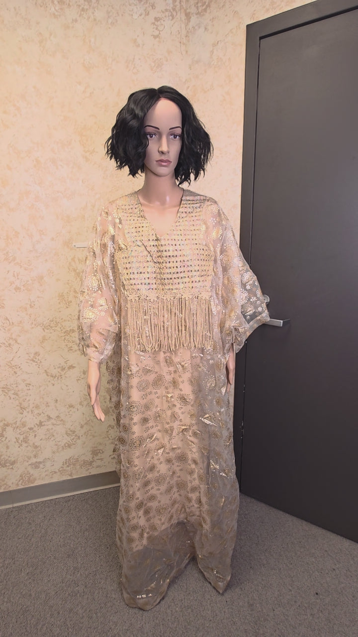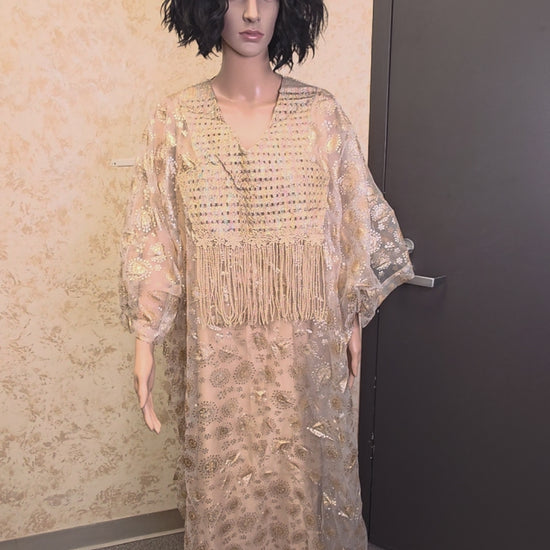 Dazzle in divine elegance with the Golden Mirage Two-Piece Kaftan Set, a breathtaking blend of glamour and grace. This luxurious ensemble features a soft inner slip dress paired with a sheer, embellished kaftan overlay adorned with shimmering sequins, delicate embroidery, and statement beaded fringe detailing.