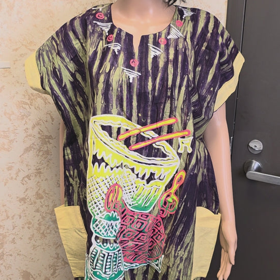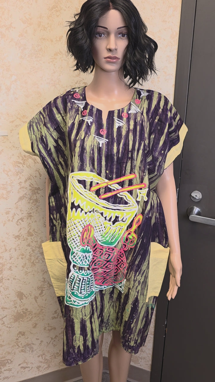 Make a bold statement with the Rhythm Essence Kampala Dress, a masterpiece inspired by African artistry and tradition. Hand-dyed in rich earthy tones of olive and deep purple, this piece showcases a striking drum and pattern motif that celebrates culture and creativity.