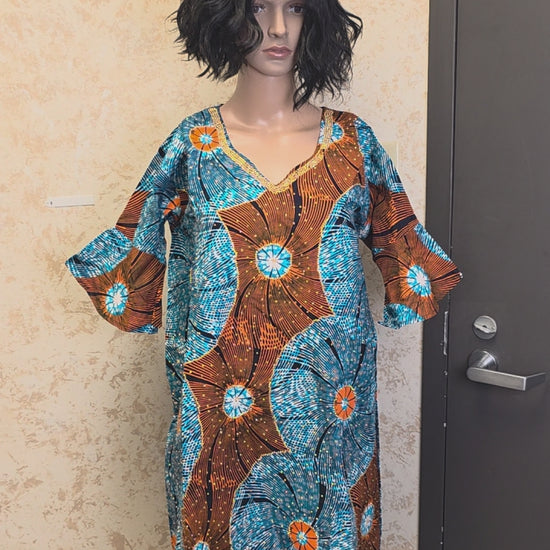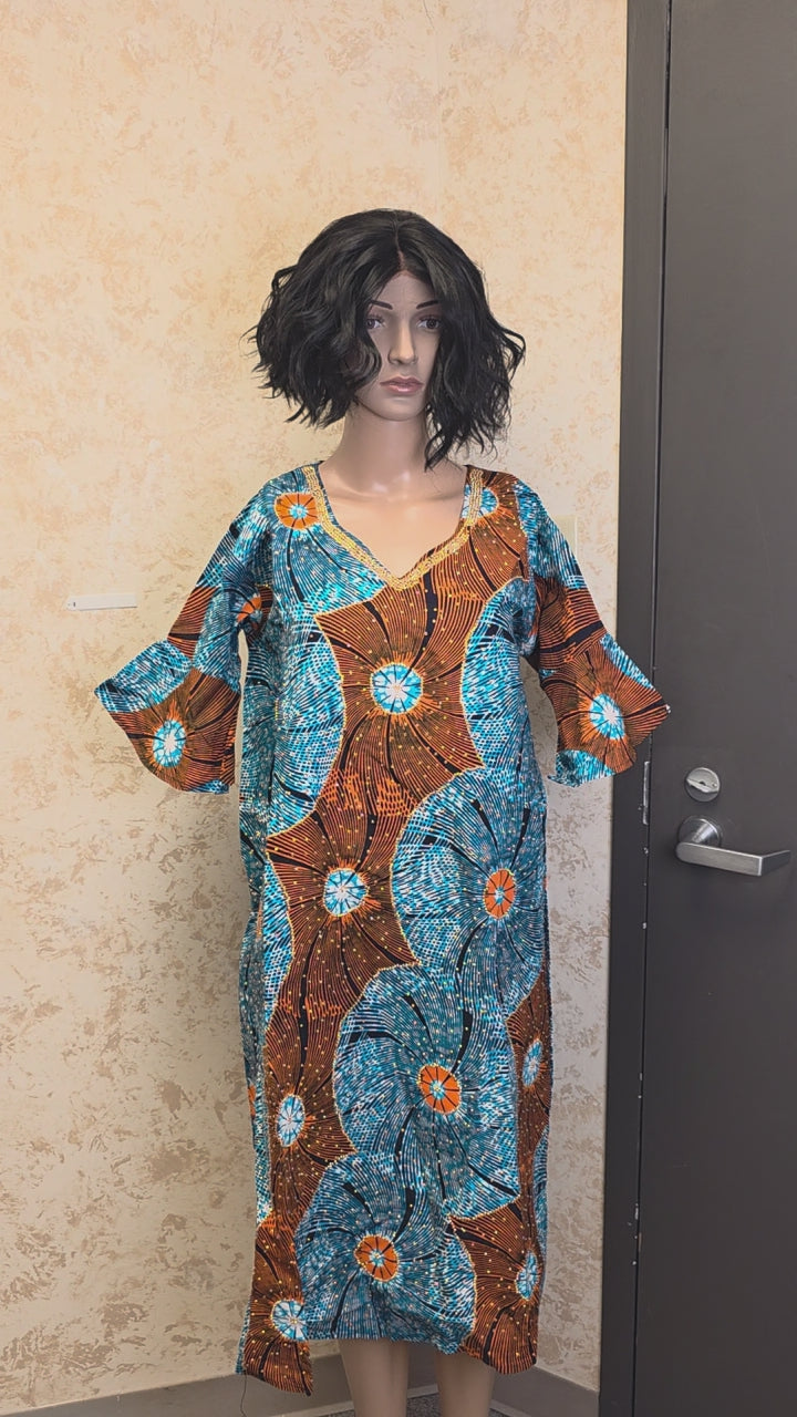 Channel radiant confidence with the Sunburst Waves Ankara Dress, a dazzling blend of tradition and bold design. Crafted from premium Ankara fabric, this dress features mesmerizing patterns of blue, orange, and brown that flow together like waves under the sun. Its loose silhouette and wide sleeves offer comfort without compromising elegance — making it perfect for everyday wear or special cultural events.