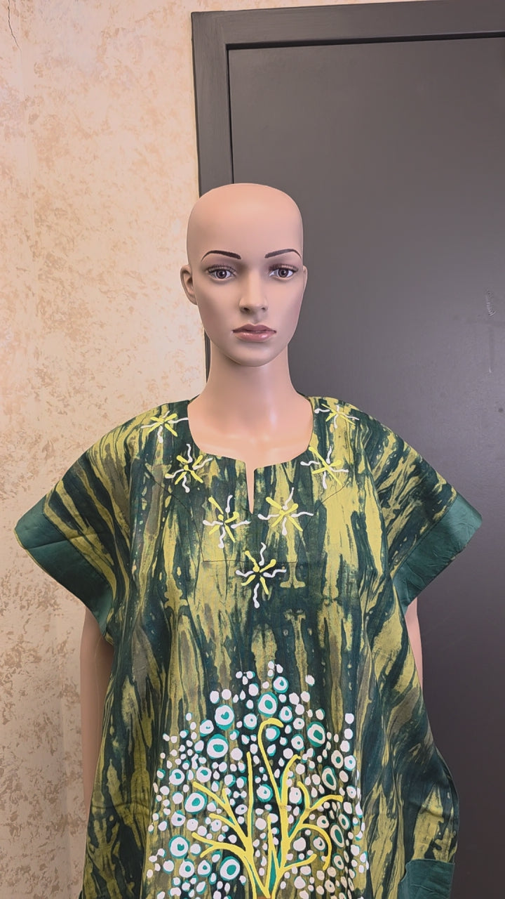 Embrace nature and culture with the Tree of Life Kampala Dress, a hand-dyed piece that beautifully represents growth, strength, and connection. The design features a symbolic tree artwork at the center, hand-painted in earthy tones of gold, white, and turquoise against a rich green and mustard background.
